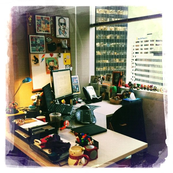 My team (which is just me for the next half hour or so) swapped pods with the Sales Team, and there was a lovely window seat available. I was hesitant to take it (for reasons that will become clear in a moment), but my boss insisted .. and here I am. I am not so much excited about the window (the glare when the sun comes out will drive me insane) as I am about the triumphant return of my access to a windowsill: I can put all my crap back! Hooray!