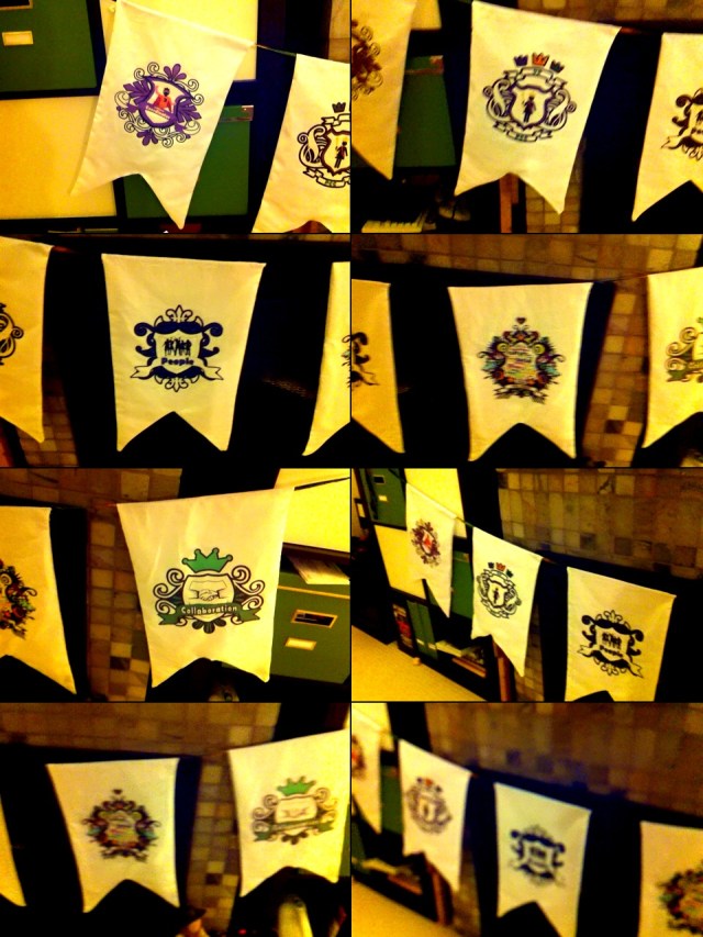 I couldn’t find a recipe for the style of flag I wanted, so I kind of made one up. They’re not perfect – neither my sewing skills nor my crest-making skills are really existent at all, but they’ll pass. It helps that they’ll be hung from the ceiling, so no one can really look too closely. I’m kind of proud of them, flaws and all – I sewed a thing! Five things! And I only swore at the sewing machine 9 times, and needed Josh to help me fix it 4 times! Craftiness is AWESOME!