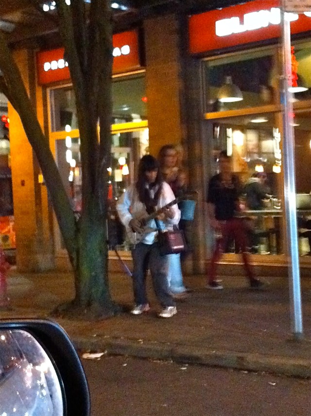 .. and so on and so forth. We drove Gill home afterwards, which was interesting as she lives downtown. The streets were packed with leftover fireworks viewers, and we got to see the two coolest people in Vancouver hands down: a tall black guy dressed in white pants and a white vest, wearing white sunglasses, and carrying a Casio keyboard looking for all the world as though he stepped out of an 80’s synth video, and an old Native man walking with a cane with a portable amp around his waist, playing metal licks on an electric guitar on Granville Street. Both of these guys were completely fucking awesome, and I salute them. I wasn’t able to get a picture of 80’s guy, and here’s a really lousy picture of Metal Man:
