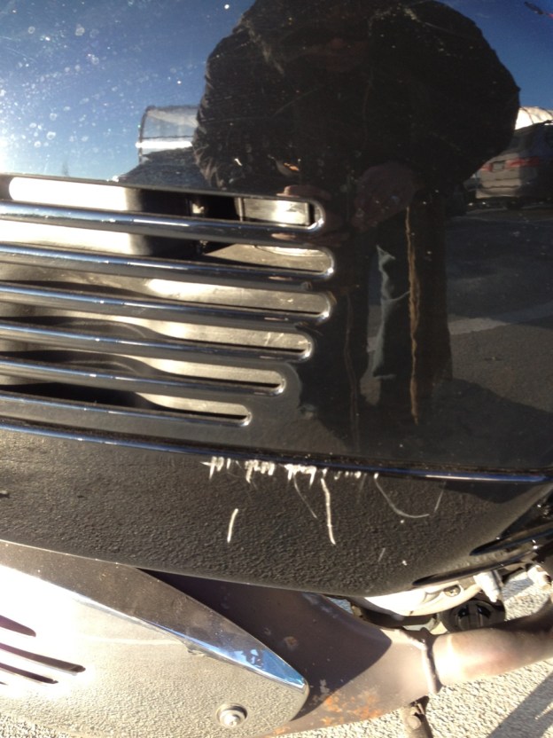 See, I didn’t so much as drop Lola as I did completely fall off of her. Luckily, I wasn’t moving at the time (my relationship with gravity is an abusive one at best) and the damage is relatively minor; confined to her lower side bumper (and on the only piece of her body made out of plastic). I also made it 32 months with the Vespa before I had an incident – my first crash on Sally happened 13 months in (wet leaves), and I banged up Oscar but good on Day 6 (tipped over trying to turn around on a hill, slid down it). Getting a little banged up in almost inevitable, and I should be at least pleased that it was an incredibly minor event that didn’t hurt all that much. And I will be, later. Right now: pouting. Lots and lots of pouting.