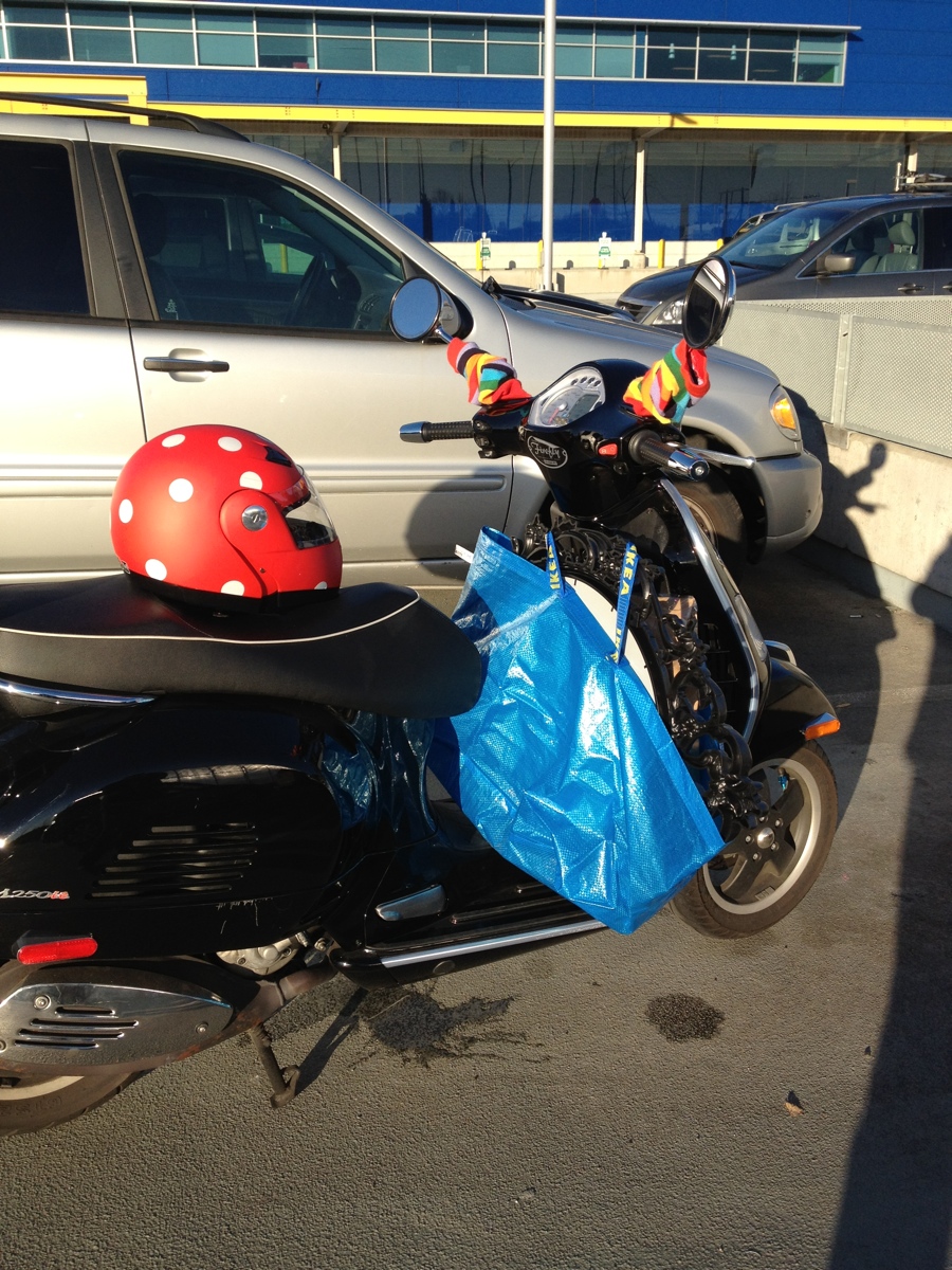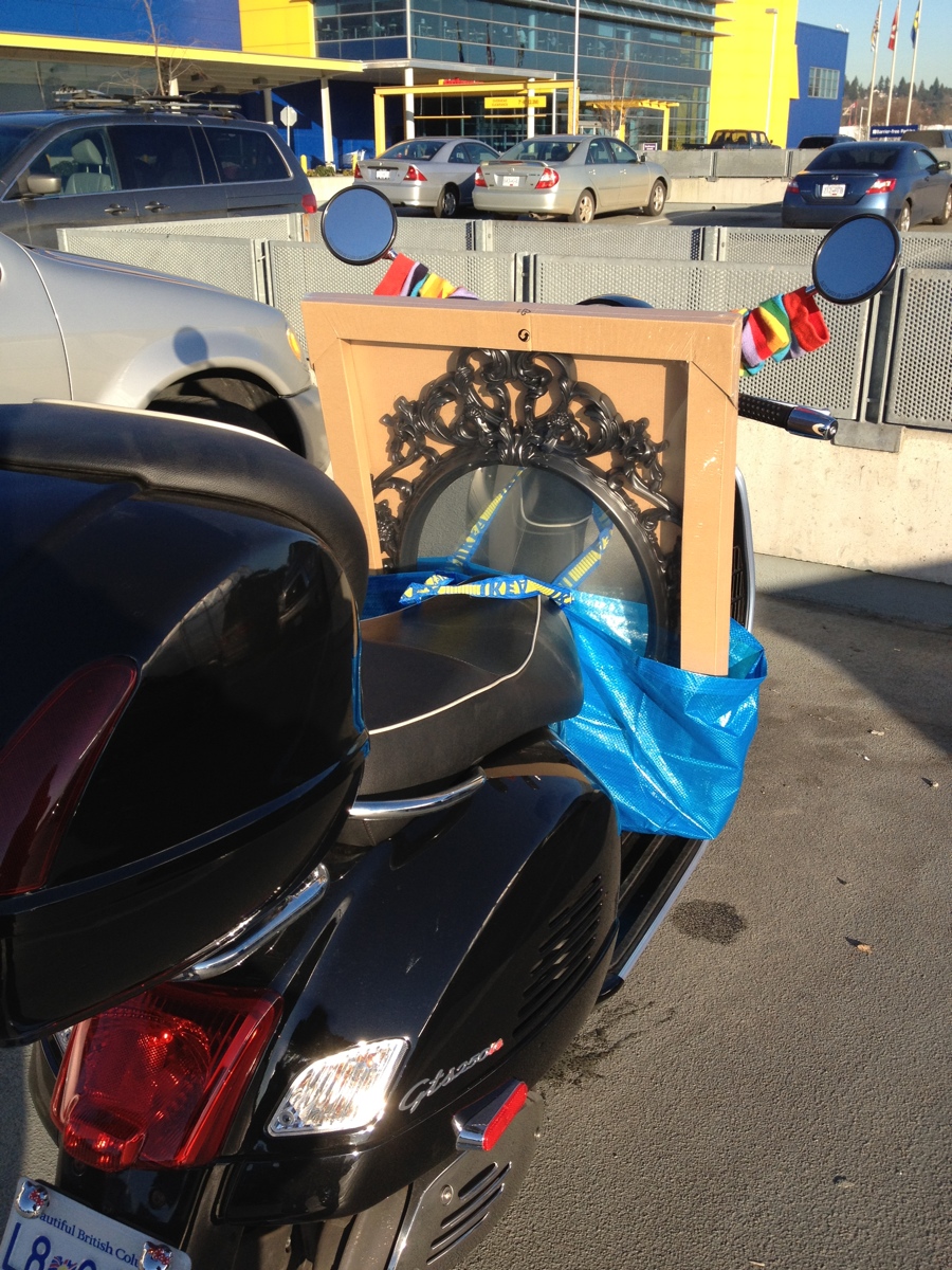 It was a gorgeous afternoon, so I hopped on Lola and went for a ride. I decided to go to Ikea so I could pick up the mirror I wanted for my Lady Cave – I knew it was pretty big, but I was confident it would fit. After all, I’ve ridden home with lamps, moving boxes, 40lb bags of cat food – how hard could it be? I enjoyed a glorious ride out to Coquitlam, had some meatballs for lunch, then bought my mirror. Hooray!